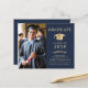 Elegant and budget-friendly dark blue college graduation announcement featuring a gold grad cap, the graduate's photo, and their name in classic gold serif typography. Add their school, major, honors or future plans. This budget semi-gloss paper is similar in weight to photo paper -- a larger 5x7 traditional card stock version is also available (message us for the link).