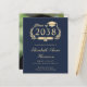Formal budget-friendly dark blue college graduation announcement featuring "Class of" in a light gold illustration of a laurel wreath incorporating a grad cap topper and diploma and the graduate's name in an elegant light gold script. Add their school, major, honors or future plans. Their photo fills the back of the card. This budget semi-gloss paper is similar in weight to photo paper. A larger 5x7 traditional card stock version is also available (message us for the link).