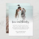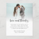 Budget 2 Photo Bold Script Wedding Love Thanks. A budget friendly SMALLER 4.5” x 5.6” alternative. Available in a SEMI GLOSS 110 lb CARD STOCK or a SATIN FINISH 80 lb THINNER PAPER STOCK. Love and thanks is in a bold set handwritten style. Easily personalise the rest of the text to your own details and replace the sample photo with your favorite from your day.