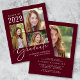 Budget-friendly burgundy red graduation announcement and party invitation featuring a three picture photo collage and "Graduate" written in a stylish white script, and the grad's name, class year and school or university in modern white typography. On the reverse side, add an additional picture and the graduation party details.