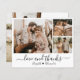 Budget, Modern, Elegant, Hand Lettered Wedding (3) Three Photo Collage Thank You Card. Stylish wedding thank you template featuring three photo on the front and one photo on the back. With the text "Love and thanks" in a swirly hand lettered typography script font with swashes in black colour on white background. Little heart between the names. Add your custom name and thank you message. If you prefer to handwrite your note, just delete the sample text to make more space.