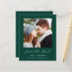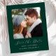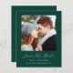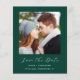 This simple, minimalist Save the Date card features a square photo above the words "Save the Date" in elegant white handwriting script, followed by the couple's names, wedding date and city in sans serif font on an emerald green background. Add a more detailed message with additional information on the reverse.