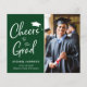 Modern budget-friendly photo green graduation announcement card. The front features your graduate's photo and "Cheers to the Grad" written in a modern white script with a grad cap on top. Easily personalize with their name and school, and add another photo on the back.