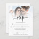 A value for money BUDGET alternative on a smaller size 4.5 x 5.6” semi-gloss 110lbs weight, which is of similar thickness to a postcard (however is not suitable to use as a postcard.). PLEASE NOTE there is ONE invite per sheet. Budget Photo Overlay Wedding QR Code RSVP. Offer your guests the convenience of posting back their reply or to reply online. Or remove the Qr code and text on the reverse if you do not require this. Add your QR code to the reply page of your wedding website on the back for an alternative option.. An informal set typography in black for the main heading RSVP and the rest of the text which can easily personalise. Replace the sample photo with your own favorite of landscape orientation.