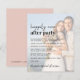 Modern blush pink budget-friendly wedding announcement and reception invitation featuring your photo overlayed with "Happily Ever After Party" in a blend of a contemporary script and bold lettering. Personalize your invitation and add your names in a signature-like script. On the back, your names and wedding and reception dates are joined together by a heart (if your wedding and reception dates are different, keep your first names on the top line and your two dates separated by the heart on a second line).