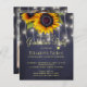 Rustic country style PHOTO BUDGET affordable graduation party stylish invitation template on dark midnight navy blue chalkboard background featuring big yellow gold sunflowers bouquets and strings of twinkle lights. ++++++++++++++++ The invitation is suitable for outdoor garden / backyard rustic country graduation evening parties. +++++++++++++++++++++++++++++ PLEASE READ THIS BEFORE PURCHASING! This is a budget affordable wedding card printed on a paper sheet (each sheet has one card). ++++ For the best rapport price quality, our advice is to choose the Semi-Gloss paper type (it is thick enough to be used for stationery) ++++ If you need envelopes, choose the ENVELOPE OPTION. +++ Double-check all the information and spelling of your text because you will receive exactly what you see - no one else will check anything before printing. ++++ This card is designed for size 4.5" x 5.6". In the case you choose another size of the card and text goes outside page, everything needs to be fixed before adding the product to cart. Please ask Live Design Service for help.