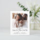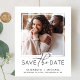 Inexpensive budget save the date announcement card featuring your photo in a square frame cut out and minimal modern typography with a touch of elegant script. Personalize with your first names, wedding date and location. On the reverse, customize your save the date details and add your names in a signature-like script.