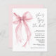 Chic budget-friendly bridal shower invitation featuring a watercolor of a light pink coquette bow, "She's tying the knot" in a modern calligraphy script, and her name and the event details in simple lettering. This budget semi-gloss paper is similar in weight to photo paper. A larger 5x7 traditional card stock version is also available (message us for the link).