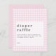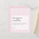 A budget price SMALLER 4.5” x 5.6” alternative. The SATIN FINISH 80 lb IS A THINNER PAPER STOCK (ideal for enclosures such as this), alternatively Available in a SEMI GLOSS 110 lb CARD STOCK (ideal for invitations). Envelopes are an optional extra and are slightly larger than the card size. Pink Gingham Diaper Raffle enclosure. Baby Girl. The header is large in stylish lowercase with the details at the bottom on an opacity layer overlaid onto the gingham background. Easily personalise the text to your own details.