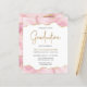 This trendy graduation party invitation features a top and bottom border of watercolor agate geode in shades of pink with faux gold glitter highlights. The word "Graduation" appears in faux gold glitter in decorative modern handwriting font. Customize the invitation with the name of the graduate in gold colored text and the party details in charcoal gray on a white background. A matching pink and gold agate image appears on the reverse side.