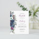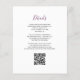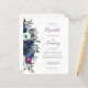 The left-hand edge of this romantic wedding invitation features a watercolor floral bouquet of plum purple and navy blue flowers and greenery. The customizable text combines plum handwriting with charcoal gray copperplate and italic fonts on a white background. The reverse side provides space for wedding details on a solid white background, along with a QR code guests can scan to visit your website and RSVP, which saves the cost of printing and mailing separate RSVP cards.