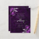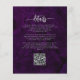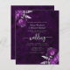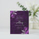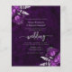 This elegant wedding invitation features plum floral bouquets set off with silver faux foil greenery in two corners, on a background image of purple watercolor agate. The customizable silver gray text combines serif, italic and handwriting fonts. The reverse side provides space for wedding details, along with a QR code guests can scan to visit your website and RSVP.