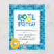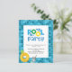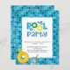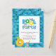 A pool party invitation with blue pool tiles as background, a pineapple and a summer drink. Personalize and add party details. Perfect for a pool or 4th of July party.