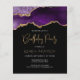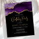 This trendy birthday invitation features a watercolor image of an agate geode in shades of purple with faux gold highlights. The words "Birthday Party" appear in faux gold glitter in decorative modern handwriting font. Customize it with the name of the honoree in gold art deco font and the party details in white sans serif type. The same purple agate image appears on the reverse side.