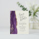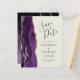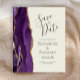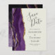 The left-hand edge of this elegant modern wedding invitation features a purple watercolor agate border trimmed with faux gold glitter. The customizable text combines charcoal gray handwriting, copperplate and italic fonts on an ivory background. The reverse side features a matching purple and gold agate design.