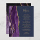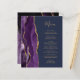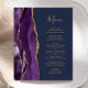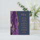 The left-hand edge of this elegant modern wedding menu features a purple watercolor agate border trimmed with faux gold glitter. The customizable text combines gold-colored handwriting script and copperplate fonts on a navy blue background. The reverse side features a matching purple and gold agate design.