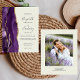 The left-hand edge of this elegant modern wedding invitation features a purple watercolor agate border trimmed with faux gold glitter. The customizable text combines charcoal gray handwriting, copperplate and italic fonts on an ivory background. Easily replace the sample image on the back with your own vertical photo, and add a brief message with additional information such as your wedding website URL.