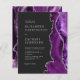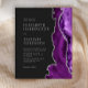 The right edge of this elegant modern wedding invitation features a purple watercolor agate border trimmed with faux silver glitter. The customizable text combines silver gray serif, copperplate and italic fonts on a slate black background. The reverse side features a matching purple and silver agate design.