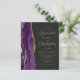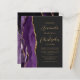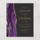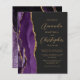 The left-hand edge of this elegant modern wedding invitation features a purple watercolor agate border trimmed with faux gold glitter. The customizable text combines gold-colored script and sans serif fonts on a slate black background. The reverse side features a matching purple and gold agate design.