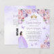 This lovely quinceañera invitation features a border of lilac purple and blush pink roses on a purple watercolor background. A gold tiara, a brunette girl in a purple princess dress and small purple butterflies decorate the text. The word "Quinceañera" and the name of the guest of honor appear in elegant purple handwriting script, with the remaining text in gray sans serif font. Add additional text on the back, along with a QR code to help your guests visit your quinceañera website and RSVP online.