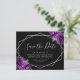 This elegant budget wedding save-the-date card features a silver geometric frame decorated with purple and silver flowers on a black background. The customizable text combines silver gray whimsical handwriting, copperplate and italic fonts.