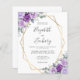 This elegant modern wedding invitation features a gold geometric frame decorated with purple and lilac watercolor flowers and eucalyptus greenery on a white background. The customizable text combines charcoal gray whimsical handwriting, copperplate and italic fonts. Add additional details on the back, along with a QR code to help your guests visit your wedding website. (NOTE: Envelopes are not included automatically with this budget invitation. To add envelopes to your order, please use the "Envelopes" drop-down menu.)