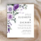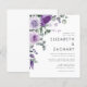This modern wedding invitation features a watercolor arrangement of purple and lilac flowers and eucalyptus greenery arching across the upper left-hand corner. Edit the charcoal gray sans serif text with the couple's names and wedding details on a white background. The reverse side is solid white. NOTE: Envelopes are not automatically included with these budget invitations, so please remember to choose the "white envelopes" option!