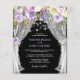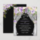 Elegant budget rustic wedding invitations featuring a black chalkboard background, wedding drapes, purple floral watercolor displays, string lights, and a wedding template that is easy to personalize.