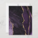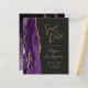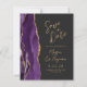 The left-hand edge of this elegant modern wedding invitation features a purple watercolor agate border trimmed with faux gold glitter. The customizable text combines gold-colored modern handwriting script, copperplate and italic fonts on a dark charcoal gray background. The reverse side features a matching purple and gold agate design.