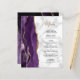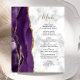 The left-hand edge of this elegant modern wedding menu features a purple watercolor agate border trimmed with faux gold glitter. The customizable text combines gold-colored handwriting script with black copperplate font on a gray and white marble texture background. The reverse side features a matching purple and gold agate design.