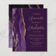 The left-hand edge of this elegant modern wedding invitation features a purple watercolor agate border trimmed with faux gold glitter. The customizable text combines gold-colored script and sans serif fonts on a plum background. The reverse side features a matching purple and gold agate design.