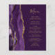 The left-hand edge of this elegant modern wedding menu features a purple watercolor agate border trimmed with faux gold glitter. The customizable text combines gold-colored handwriting script and copperplate fonts on a plum background. The reverse side features a matching purple and gold agate design.