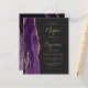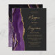 The left-hand edge of this elegant modern wedding invitation features a purple watercolor agate border trimmed with faux gold glitter. The customizable text combines modern gold-colored script and sans serif fonts on a slate black background. The reverse side features a matching purple and gold agate design.
