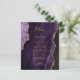 This elegant modern wedding menu features a purple watercolor agate border trimmed with faux gold glitter. The customizable text combines gold-colored handwriting script and copperplate fonts. The reverse side features a matching purple and gold agate design.