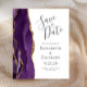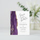 The left-hand edge of this elegant modern wedding invitation features a purple watercolor agate border trimmed with faux gold glitter. The customizable text combines charcoal gray handwriting, copperplate and italic fonts on a white background. The reverse side features a matching purple and gold agate design.