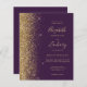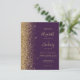 The left-hand edge of this elegant modern wedding invitation features a gold faux glitter border. The customizable text combines pale gold-colored handwriting, copperplate and italic fonts on a dark purple background. The reverse side provides space for wedding details on a solid purple background, along with a QR code guests can scan to visit your website and RSVP.