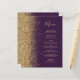 The left-hand edge of this elegant modern wedding menu features a gold faux glitter border. The customizable text combines gold-colored whimsical handwriting script and copperplate fonts on a purple background. The reverse side features a matching purple and gold glitter design.