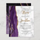 The left-hand edge of this elegant modern wedding invitation features a purple watercolor agate border trimmed with faux gold glitter. The customizable text combines gold-colored calligraphy script and black sans serif fonts on a gray and white marble background. The reverse side features a matching purple and gold agate design.