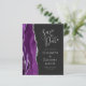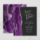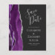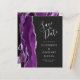 The left-hand edge of this elegant modern wedding save the date card features a purple watercolor agate border trimmed with faux silver glitter. The customizable text combines silver gray handwriting and copperplate fonts on an off-black background. The reverse side features a matching purple and silver agate design. NOTE: Envelopes are not automatically included with these budget invitations, so please remember to choose the "blank white envelopes" option!