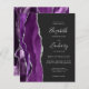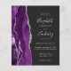 The left-hand edge of this elegant modern wedding invitation features a purple watercolor agate border trimmed with faux silver glitter. The customizable text combines handwriting, copperplate and italic fonts in silver gray on an off-black background. The reverse side features a matching purple and silver agate design.