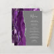 The left-hand edge of this elegant modern wedding menu features a purple watercolor agate border trimmed with faux silver glitter. The customizable text combines silver gray handwriting script and copperplate fonts on a medium gray background. The reverse side features a matching purple and silver agate design.