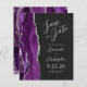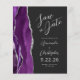 The left-hand edge of this elegant modern wedding save the date card features a purple watercolor agate border trimmed with faux silver glitter. The customizable text combines silver gray script and sans serif fonts on a slate black background. The reverse side features a matching purple and silver agate design.