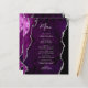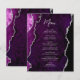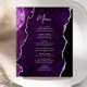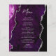 This elegant modern wedding menu features a purple watercolor agate background trimmed with faux silver glitter. The customizable text combines silver gray handwriting script and copperplate fonts. The reverse side features a matching purple and silver agate design.