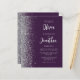 The left-hand edge of this elegant modern wedding invitation features a silver faux glitter border. The customizable text combines pale silver gray script and sans serif fonts on a dark purple background. The reverse side features a matching purple and silver design.