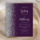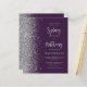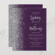 The left-hand edge of this elegant modern wedding invitation features a silver faux glitter border. The customizable text combines pale silver gray calligraphic script and sans serif font on a dark purple background. The reverse side features a matching purple and silver design.