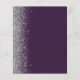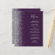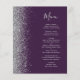 The left-hand edge of this elegant modern wedding menu features a silver faux glitter border. The customizable text combines silver gray handwriting script and copperplate fonts on a dark purple background. The reverse side features a matching purple and silver design.