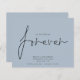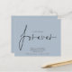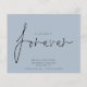 Budget QR Code We Decided on Forever Blue Save The Date A budget price SMALLER 4.5” x 5.6” alternative. Available in a SEMI-GLOSS 110 lb CARD STOCK which is the default option (thicker for invitations), OR a SATIN FINISH 80 lb THINNER PAPER STOCK (ideal for enclosures). Add your QR code to your wedding website on the back. A simple design on dusty blue to invite your guests to save your date. Envelopes are an optional extra. We Decided on Forever which is in a stylish set script is in the center.The rest of the text you can easily personalise. Text and background colors can be changed if you wish to better suit your wedding theme via the customise further option.
