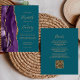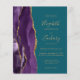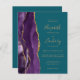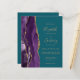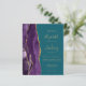 The left-hand edge features a purple watercolor agate border trimmed with gold faux glitter. The customizable text combines gold-colored handwriting, copperplate and italic fonts on a teal blue background. The reverse side provides space for wedding details on a solid teal background, along with a QR code guests can scan to visit your website and RSVP, which saves the cost of printing and mailing separate RSVP cards.