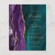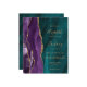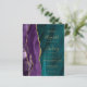 The left-hand edge features a purple watercolor agate border trimmed with gold faux glitter. The customizable text combines gold-colored handwriting, copperplate and italic fonts on a teal blue agate background. The reverse side provides space for wedding details on a teal agate background, along with a QR code guests can scan to visit your website and RSVP, which saves the cost of printing and mailing separate RSVP cards. NOTE: Envelopes are not automatically included with these budget invitations, so please remember to choose the "white envelopes" option!