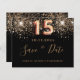 A girly and trendy Save the Date for a Quinceañera, 15th birthday party. A black background decorated with faux gold glitter. Templates for a date and name and text. Golden colored letters. The text: Save the Date is written with a large trendy hand lettered style script.